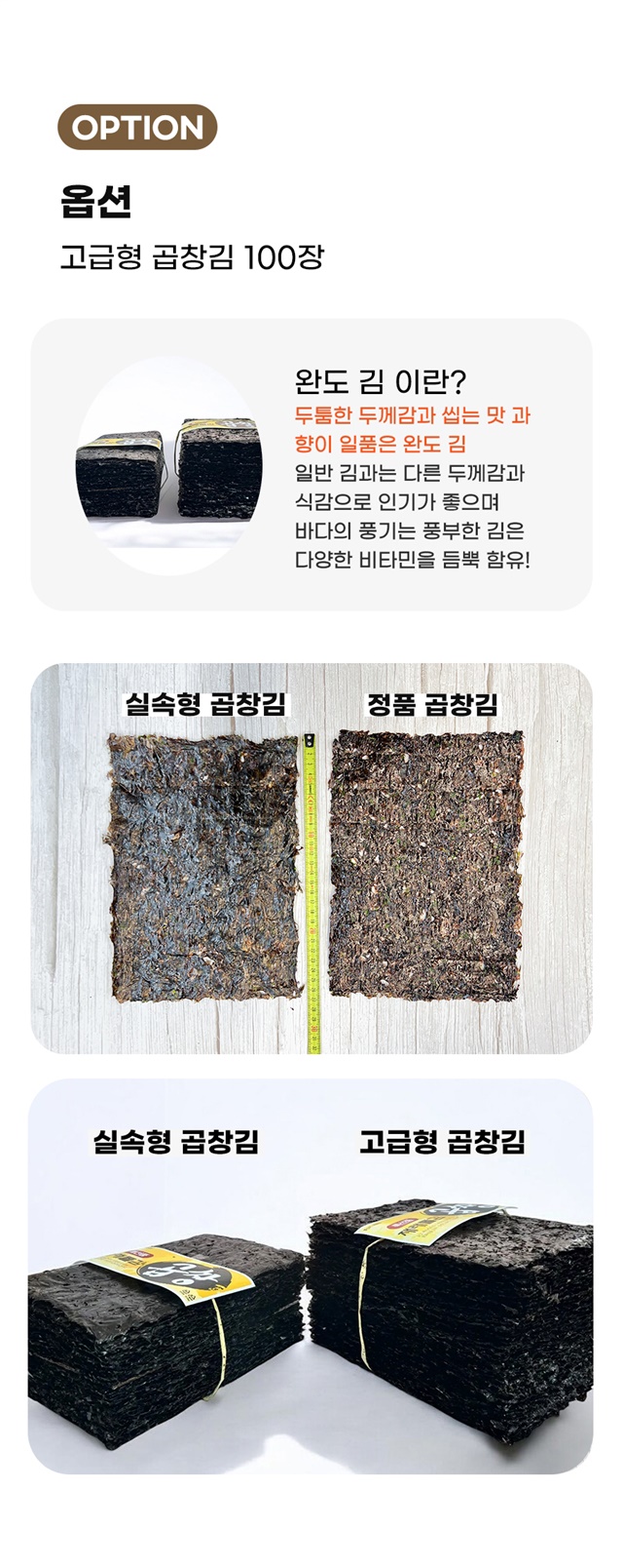 | 7. 상품구성 | 고급형 생 곱창김 100장 |
