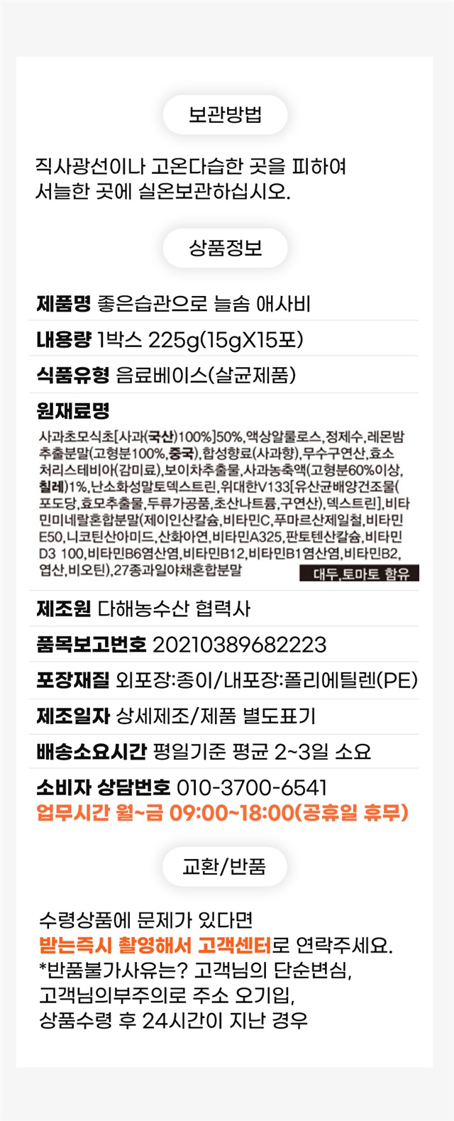 | 1-6. 원재료명 (「농수산물의 원산지 표시 등에 관한 법률」에 따른 원산지 표시 포함) 및 함량(원재료 함량 표시대상 식품에 한함) | 상품상세참조 |
